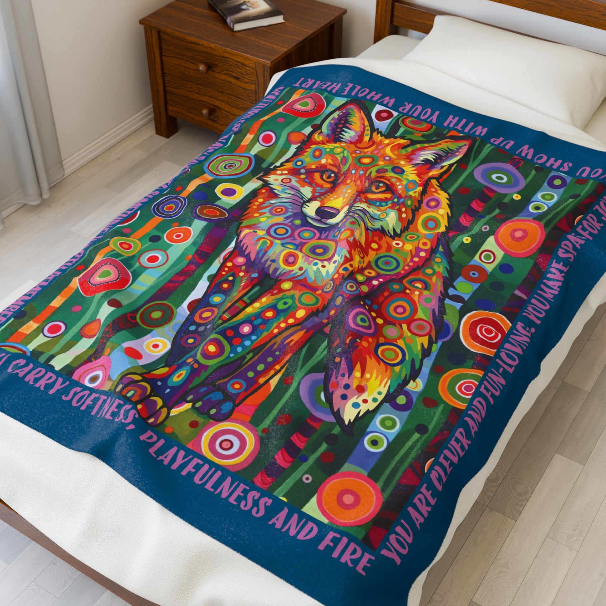 This vibrant fox plush fleece blanket is filled with affirming words that honor a woman who shows up with her whole heart—clever, playful, warm, and full of fire.