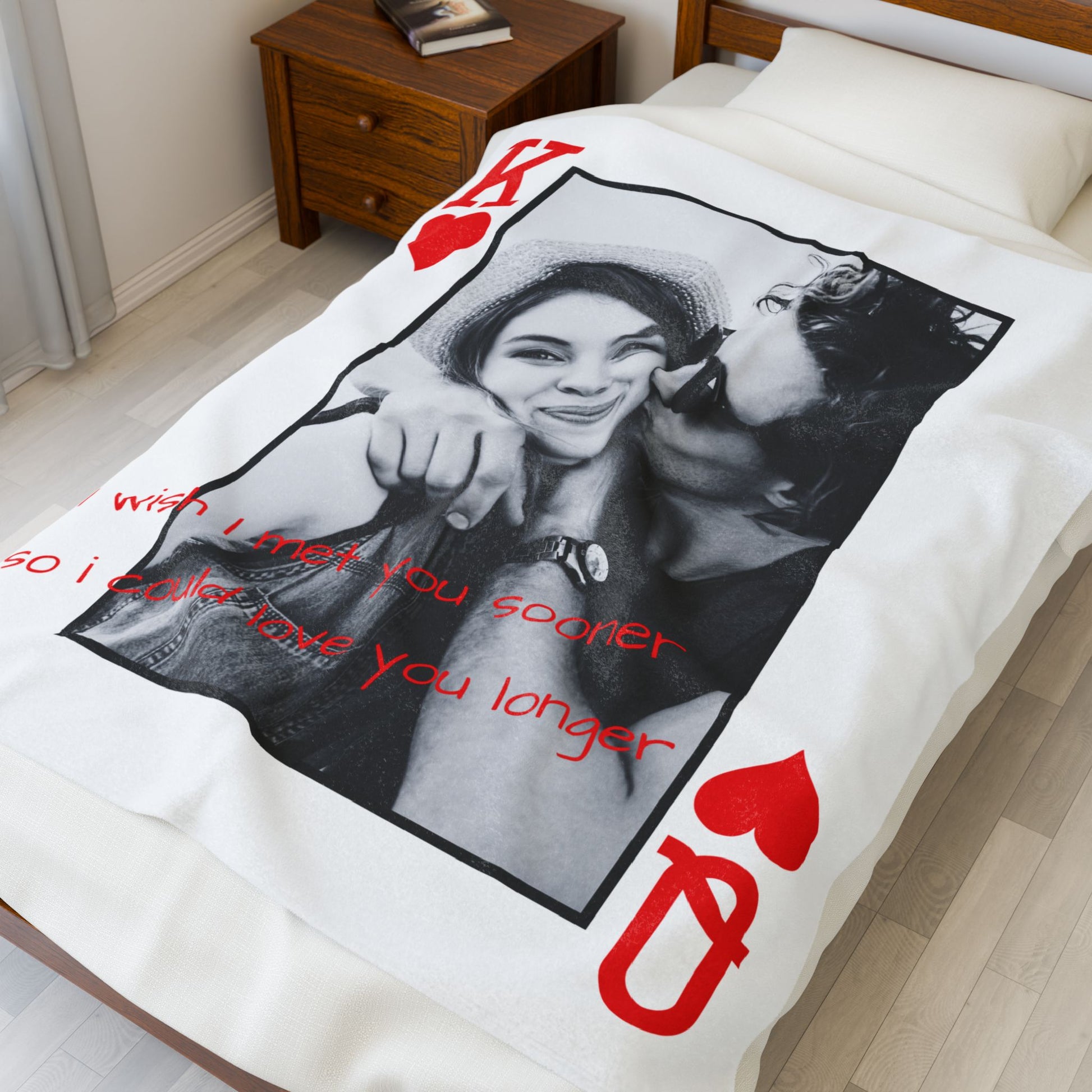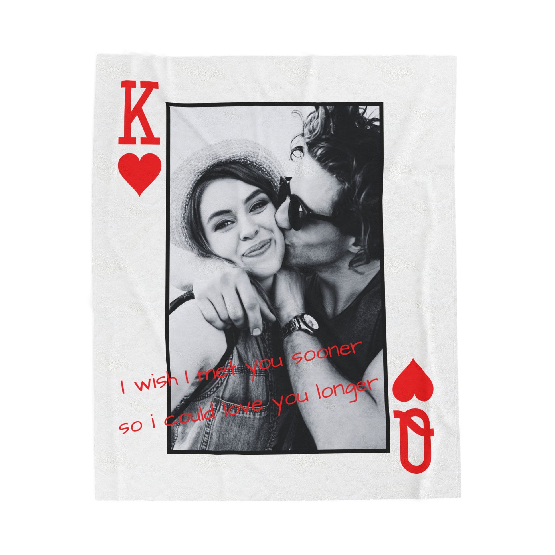 Turn your favorite photo into a deeply personal player card–style keepsake blanket, featuring the heartfelt message: “I wish I had met you sooner so I could love you longer.”